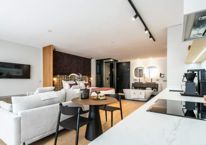 Das komfortable King-Size-Bett mit Premium-Matratze garantiert erholsamen Schlaf. Bequeme Sitzmöbel und ein moderner Smart-TV mit deutschem Fernsehen laden zu entspannten Abenden ein. Dank des schnellen, kostenlosen WLANs eignet sich die Suite hervorragend für Homeoffice, Streaming und Videokonferenzen.