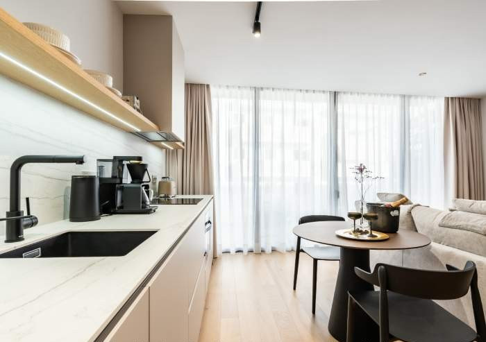 Die Designer-Küche ist vollständig ausgestattet und erfüllt höchste Ansprüche: Geschirrspüler, Mikrowelle, Waschmaschine und hochwertige Küchengeräte ermöglichen unabhängiges und komfortables Wohnen. Das großzügige Badezimmer ist eine kleine Wellnessoase mit Dusche und Badewanne, flauschigen Bademänteln und Hausschuhen.