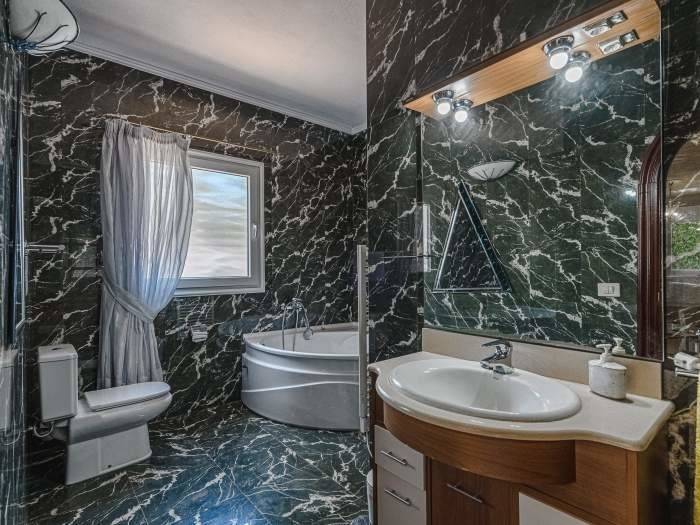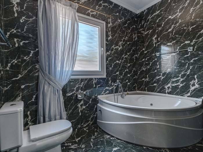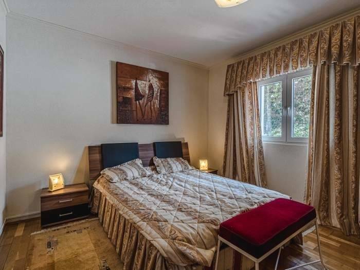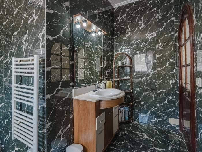 Das ruhige Schlafzimmer ist ein Rückzugsort für erholsame Nächte. Die Betten sind komfortabel ausgestattet und garantieren angenehmen Schlaf nach aktiven Urlaubstagen in der Natur Teneriffas. Ein besonderes Highlight ist das luxuriöse Badezimmer aus edlem schwarzem Marmor. Es verfügt über eine großzügige Badewanne, eine separate Dusche, WC und Bidet. Weiche Handtücher und bereitliegende Bademäntel verleihen dem Raum eine spa-ähnliche Atmosphäre und sorgen für zusätzlichen Komfort.