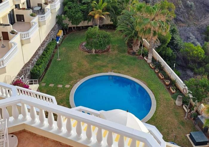 Vom großen Balkon aus genießen Sie einen herrlichen Blick auf den Atlantik, die Insel Gomera und die berühmten „Acantilados de Los Gigantes“. Der Balkon ist mit Balkonmöbeln und Sonnenliegen ausgestattet. Im gemeinschaftlichen Garten steht ein Swimmingpool zur Verfügung.